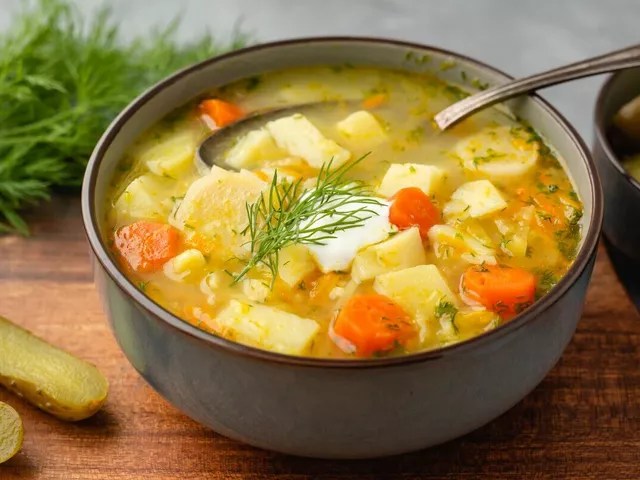 Em uma panela, coloque o azeite e leve ao fogo médio para aquecer. Adicione a cebola e o alho e doure. Acrescente as batatas, as cenouras, os pepinos e refogue por 5 minutos. Junte o caldo de legumes e tempere com sal e pimenta-do-reino. Cozinhe até os legumes ficarem macios. Desligue o fogo e sirva em seguida com endro.