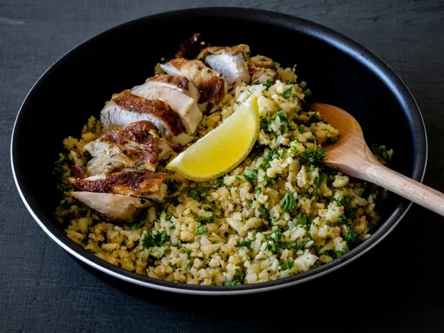 Em uma panela, aqueça um fio de azeite e refogue o alho. Acrescente a couve-flor triturada, o sal e a pimenta-do-reino. Cozinhe por cerca de 5 minutos, mexendo sempre, até que a couve-flor fique macia, mas ainda soltinha. Finalize com a salsinha e misture bem. Sirva o arroz de couve-flor em um prato ou tigela, disponha as fatias de frango grelhado por cima e finalize com a fatia de limão-siciliano. Sirva em seguida.