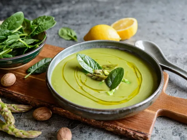 Junte o espinafre e cozinhe por mais 2 minutos. Desligue o fogo, aguarde amornar e transfira a mistura para um liquidificador. Bata até obter uma sopa cremosa. Volte para a panela e tempere com sal. Finalize com o suco de limão e um fio de azeite de oliva. Sirva em seguida.