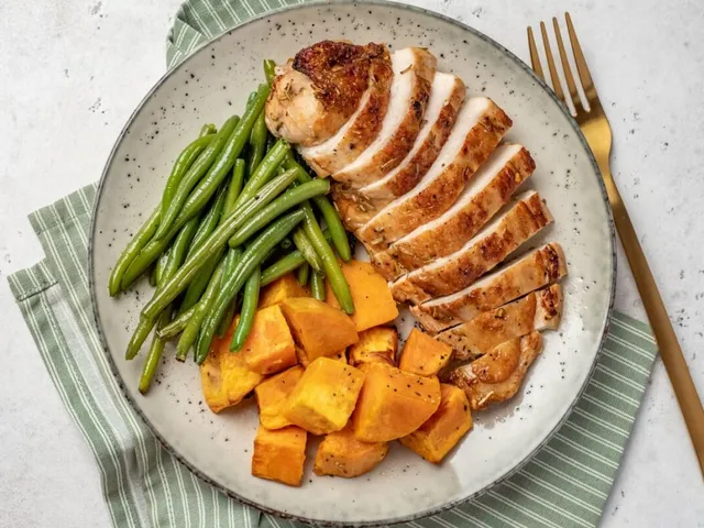 Em uma panela com água fervente e uma pitada de sal, cozinhe a vagem em fogo médio por 5 a 7 minutos, até ficar macia, mas ainda firme. Escorra e reserve. Aqueça uma frigideira antiaderente em fogo médio e grelhe o frango por cerca de 6 a 8 minutos de cada lado, até ficar bem dourado e cozido por dentro. Sirva o peito de frango fatiado com a vagem e a batata-doce laranja assada.