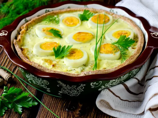 Após, em uma superfície limpa, abra a massa e forre uma forma de fundo removível. Fure o fundo com um garfo e leve ao forno preaquecido a 180 °C por 10 minutos para pré-assar. Despeje o creme com o repolho sobre a massa pré-assada. Distribua as rodelas de ovo cozido por cima com delicadeza. Leve ao forno por 35 a 40 minutos, até o recheio firmar e dourar levemente.