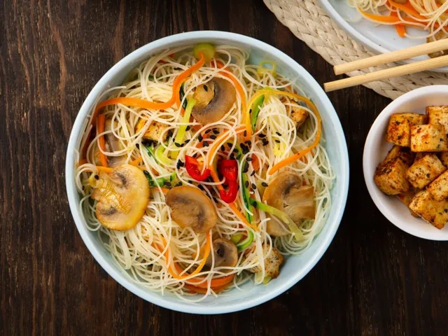 Macarrão de arroz com tofu, cogumelo e legumes salteados