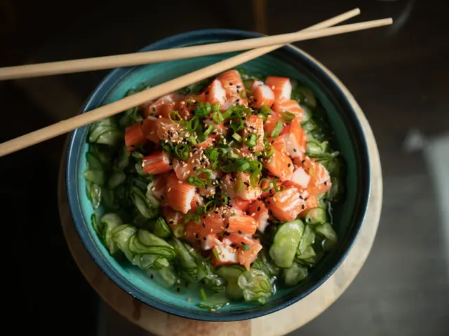 Em um recipiente, misture o salmão, o kani, a cebolinha, o azeite e o restante do sal. Em um prato fundo ou tigela, coloque o pepino temperado formando a base. Distribua sobre ele a mistura de salmão e kani. Finalize com o gergelim branco e preto por cima. Sirva em seguida.