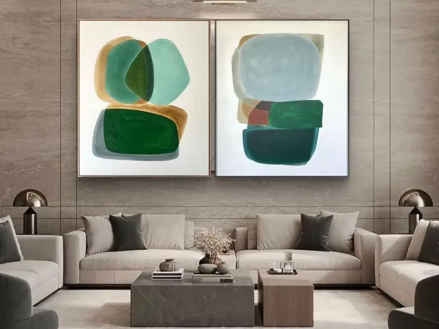 Azuis profundos, verdes-musgos e variações minerais surgem como contraponto à velocidade do cotidiano. Nas obras autorais, essas cores funcionam como campos de contemplação, especialmente em salas amplas e áreas sociais que pedem equilíbrio visual.