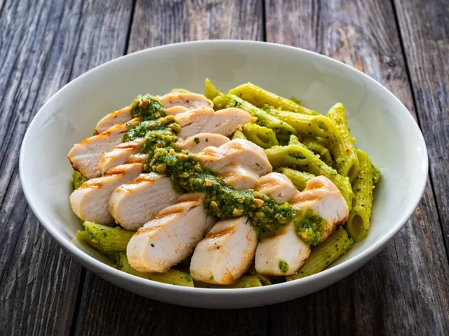 Em uma tigela, tempere os peitos de frango com suco de limão, sal e pimenta-do-reino. Aqueça uma frigideira com um fio de azeite em fogo médio e grelhe os peitos de frango até dourarem dos dois lados e ficarem cozidos por dentro. Corte em fatias. Em um prato misture o macarrão ainda quente com o molho pesto, envolvendo bem. Disponha as fatias de frango grelhado por cima e finalize com um pouco de molho pesto. Sirva em seguida.