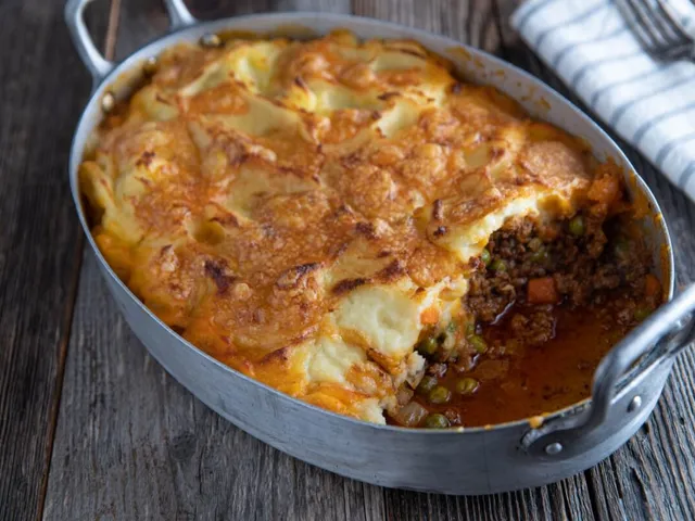 Distribua o recheio em um refratário, nivelando bem. Cubra com o purê de batata, espalhando com colher ou espátula. Faça leves ondulações na superfície. Polvilhe o queijo muçarela e o parmesão por cima. Leve ao forno preaquecido a 200 °C por 25 a 30 minutos, até dourar bem. Retire, deixe descansar por 5 minutos e sirva.