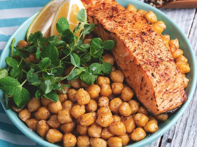 Na mesma frigideira, adicione o grão-de-bico e refogue por 3 a 5 minutos em fogo médio, mexendo sempre. Tempere com sal e pimenta-do-reino. Em uma tigela ou prato fundo, coloque o grão-de-bico, posicione o filé de salmão grelhado por cima e finalize com os brotos de ervilha. Adicione as fatias de limão-siciliano e sirva em seguida.