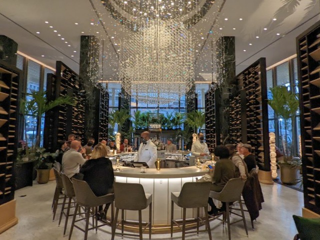 Erguido no lobby do luxuoso hotel Four Seasons, o Chandelier Bar é caro e chique. Tanto que, para petiscar, há serviço de caviar, ostras e frutos do mar.