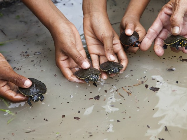 Uma força-tarefa movimenta cinco comunidades ribeirinhas e exige uma dedicação contínua de quase oito meses. É preciso deslocar-se para estas zonas de desova afim de recolher os ovos e realocá-los em locais aos olhos dos vigilantes para a choca. De janeiro a março, ocorre o nascimento das tartaruguinhas, seguido de mais 30 dias de cuidados até a fase final de liberação dos filhotes por meados de abril. Anualmente, cerca de 3 mil quelônios são soltos em segurança na natureza.