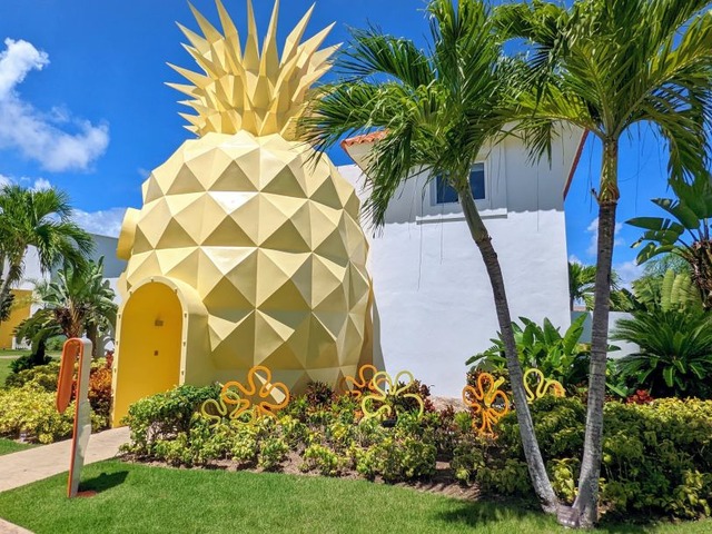 A acomodação mais famosa do hotel Nickelodeon, em Punta Cana, é a The Pineapple Villa, inspirada na casa do Bob Esponja. Com capacidade para seis hóspedes, tem um abacaxi gigante na fachada, dois quartos amplos, três banheiros revestidos de mármore (um deles com banheira e chuveiro em área externa), sala, jardins com piscina privativa e closet.