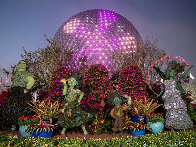 Topiárias inéditas figuram entre os grandes destaques deste ano. É possível ver designs inspirados em personagens como Mirabel, Antonio, Isabela e Luisa, do filme "Encanto". Além disso, há uma topiária da princesa Tiana, de "A Princesa e o Sapo", que tem um vestido de baile e vaga-lumes iluminados.