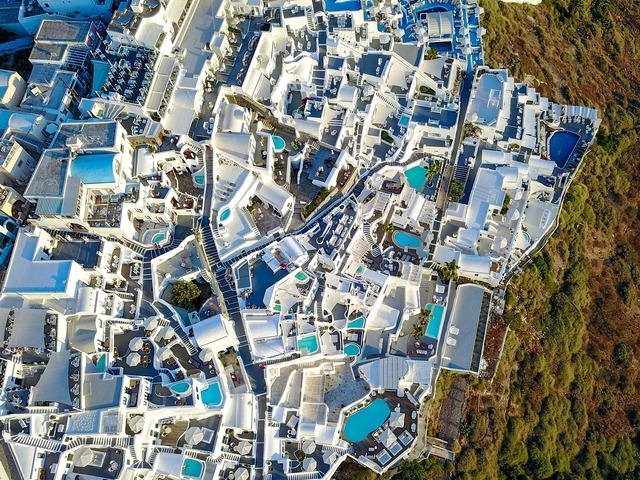 Fotos tiradas com drones permitem contemplar toda a beleza de diferentes cidades vistas de cima. Santorini, na Grécia, por exemplo, se transforma em um mix de elementos brancos com belos contrastes em azul. Já as prais da Flórida, nos Estados Unidos, exibem faixas de areia perfeitamente alinhadas com calçadões e com o mar.