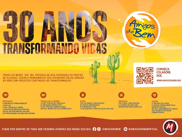 A ONG Amigos do Bem desenvolve projetos de educação, geração de trabalho e renda, acesso à água potável, cuidados de saúde e moradia digna no sertão. Atualmente, mais de 150 mil pessoas são atendidas mensalmente em 300 povoados do sertão de Alagoas, Pernambuco e Ceará. Para mais informações sobre a ONG Amigos do Bem por meio do portal e Redes Sociais: Instagram, Facebook,