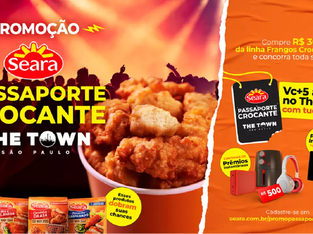 A Seara, reconhecida pela inovação, sabor, qualidade e liderança em diversas categorias do mercado de alimentos, vai surpreender os consumidores com ingressos para o setor gramado, da primeira edição do The Town, maior festival de música, cultura e arte de São Paulo. A promoção ‘Passaporte Crocante” da Seara já está disponível e os sorteios acontecem semanalmente até o início de agosto e, além da chance de ver o seu artista preferido ao vivo, os concorrentes também poderão ganhar diversos outros prêmios. As chances de ganhar os prêmios dobram com os produtos da linha Frangos Crocantes Seara.