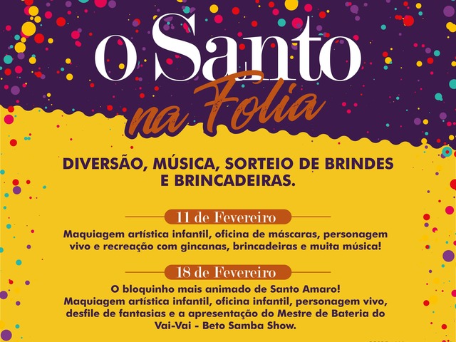 Já no sábado de Carnaval (18/2), a programação do “Santo na Folia” continua, desta vez com a participação do bloco “Mestre de Bateria do Vai-Vai – Beto Samba Show” , acompanhado da banda e passistas, ao som de samba-enredos contemporâneos. A animação continua com personagens, desfile de fantasia, brindes e maquiagem infantil com Selma Summer no Espaço Kids, também a partir das 12h.
