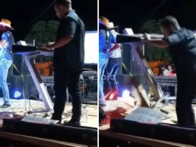 O tecladista da banda 'Estilo Uai' passou por um tremendo susto quando o palco onde o conjunto se apresentava em Salinas, no norte de Minas Gerais, cedeu. Após a estrutura despencar, ele foi parar no chão junto com o instrumento.
