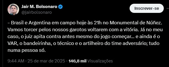 Em meio a esse cenário, Bolsonaro, que está sentado na primeira fila do julgamento, mencionou o jogo da Seleção Brasileira contra a Argentina em um post nas redes sociais, utilizando a figura do juiz de futebol para atacar o ministro Alexandre de Moraes. O ex-presidente afirmou que, em seu caso, o juiz "apita contra antes mesmo do jogo começar". A crítica de Bolsonaro sugere que ele acredita estar sendo julgado de forma tendenciosa, como se o árbitro decidisse o resultado da partida antes do apito inicial.