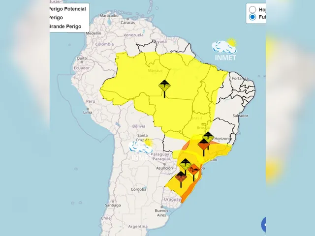 O Inmet classificou o cenário em dois níveis. No aviso de “perigo potencial”, o risco envolve precipitação entre 20 e 30 mm por hora, ou até 50 mm por dia, e ventos de 40 a 60 km/h.