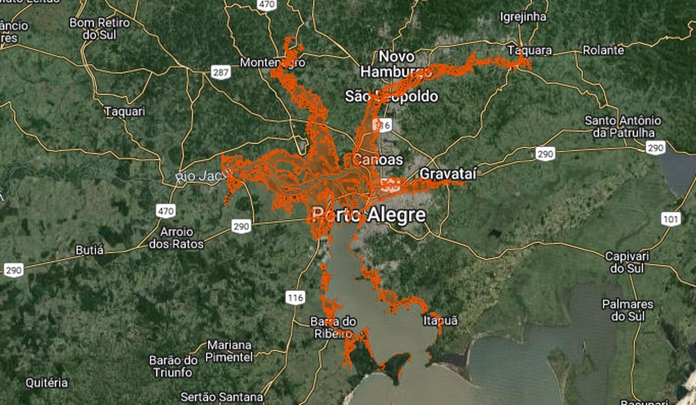 Mapa interativo permite comparar a extensão das enchentes de Porto Alegre com outras capitais