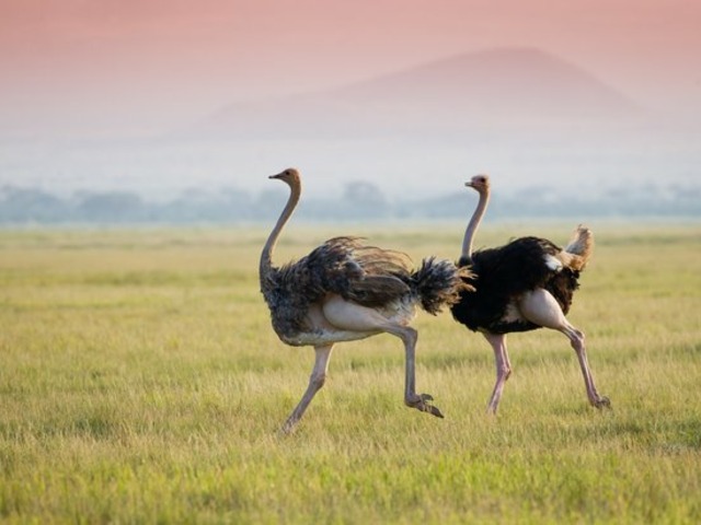 O avestruz é a maior ave do planeta e pode ser até superar o tamanho humano, chegando a cerca de 3 metros de altura e mais de 130 kg. Suas pernas longas permitem que alcance uma velocidade de até 75 km/h, uma boa ajudinha para quem não pode voar, né? E é claro que, com o seu peso, seria mesmo difícil levantar voo. Ainda assim, suas asas têm função prática: ajudam no equilíbrio do animal e também são uma forma de chamar atenção para atrair parceiros.
