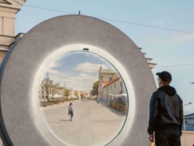 Trata-se de uma ação que mistura arte e tecnologia, com duas estruturas instaladas em Vilnius, capital da Lituânia, e Lublin, no leste da Polônia, a 600 quilômetros de distância. Cada uma dessas estruturas pesa em torno de 11 toneladas e transmite imagens ao vivo de uma cidade para a outra. O legal é que as pessoas podem parar e se comunicar com gente que eles nem conhecem em outro país.