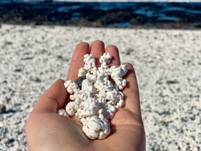 No entanto, essa é apenas uma das explicações. A outra é que a pipoca da Popcorn Bay se formou a partir de rodolitos mortos, que são uma espécie de alga corralina vermelha.
