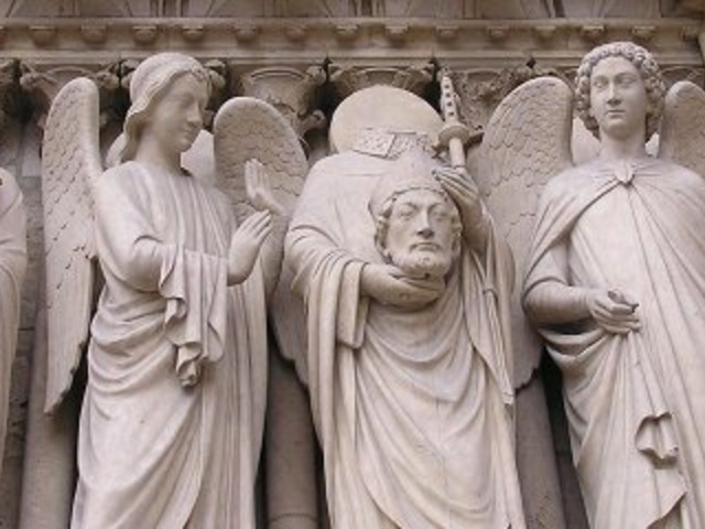 Conhecido por ser o santo padroeiro da França, São Dinis é retratado carregando a própria cabeça nas mãos para representar sua luta na conversão ao cristianismo da população local da Gália.