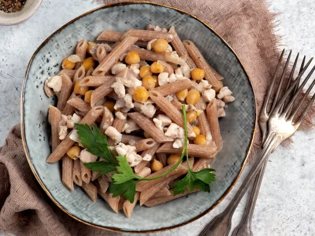 Penne integral com frango e grão-de-bico