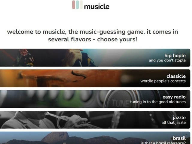 O Musicle é um game de adivinhação para navegador que conta com três novos desafios diários em cada gênero musical (ao todo são mais de 12). Para adivinhar, o usuário toca um trecho com segundos da canção e depois escolhe algum dos quatro artistas nas opções.