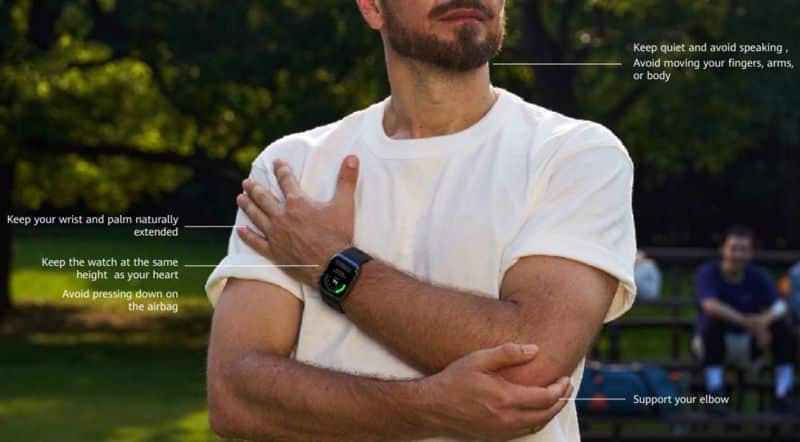 Para realizar a verificação da frequência cardíaca e pressão arterial, o usuário deve manter o braço relaxado, na altura do peito, com a palma da mão aberta (como demonstrado na imagem abaixo). Essa posição permite que a pequena bolsa de ar do smartwatch, infle adequadamente para realizar a medição².