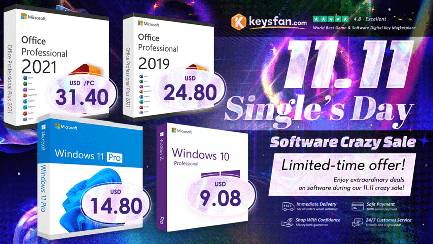 O Microsoft Office Professional 2019 também está com o menor preço deste ano – apenas US$ 24,80 para uso vitalício, o que é ótimo para quem tem um orçamento baixo. Além disso, você também pode atualizar para o Windows 11 Professional por apenas US$ 14,80 (normalmente US$ 199) na Keysfan Single’s Day Sale, que traz recursos avançados e uma aparência nova para o seu computador.