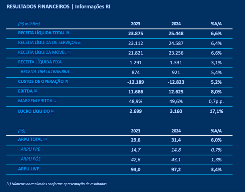 A TIM encerrou 2024 liderando o crescimento no pós-pago e a consolidação do 5G no país. O resultado é a evolução consistente dos seus indicadores financeiros e operacionais, que marcam a entrega de mais um balanço de destaque na companhia.