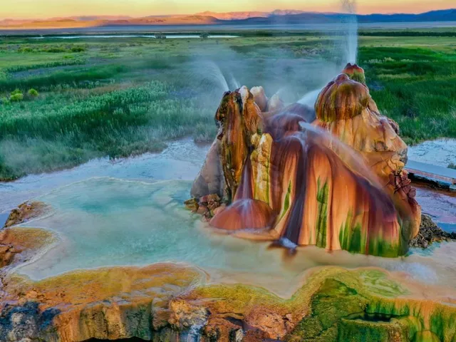 Resultado de depósitos minerais acumulados durante anos, após uma perfuração malsucedida em busca de água na década de 1960, o Gêiser Fly assumiu essa coloração brilhante devido à ação de algas termofílicas presentes nas águas quentes e minerais, que dão à formação suas cores vibrantes de vermelho, verde e amarelo.