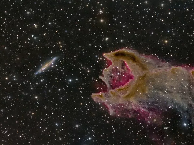 Na imagem abaixo você pode ver o que aparenta ser uma figura fantasmagórica indo atrás de uma galáxia para devorá-la. Isso, entretanto, é apenas devido à nossa mente imaginativa e a um fenômeno bem conhecido chamado de pareidolia. Na verdade, esses dois objetos sequer estão perto um do outro no espaço.